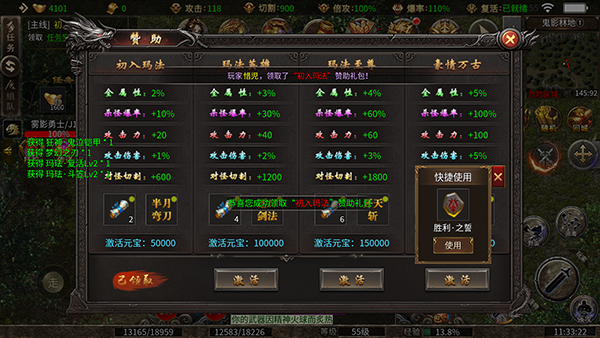中期攻略 元宝可以优先用来升级勇气勋章,能大幅提升角色攻速;灵符优先投入到禁忌之书的升级中,能拉高切割伤害数值;