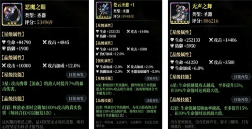 瓦伦丁、特蕾莎、伊莎贝拉三个角色最适配的圣器分别是恶魔之眼、苍云圣愈、无声之舞,属性加成如下图所示,其中恶魔之眼后续也可以给阿鲁卡多使用。
