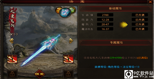 无量飞剑:攻击时有概率麻痹对应等级的BOSS,麻痹等级=法宝等级x10+人物等级