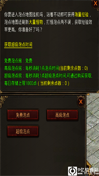 除了消耗经验丹升级,泡点地图也是快速升级的途径,对比打怪掉落经验丹升级的方式,泡点地图升级速度更快更省心;高级泡点有时间限制,高级泡点时长可以通过完成悬赏任务、参与每日累充活动获取,超级泡点需要消耗元宝购买时长才能进入。