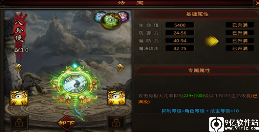 八卦镜:攻击时有概率抑制对应等级以下boss的生命回复,抑制等级=法宝等级x10+角色等级