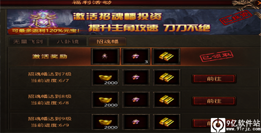 法宝可以通过参与法宝基金活动购买基金获取道具激活,激活基金后每提升一级法宝等级,都可以领到大量元宝以及金条等丰厚奖励。