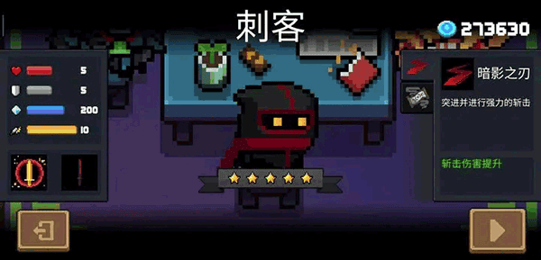 解析:让小编选,刺客应该是现在元气骑士最强的职业,非常好用。暗影之刃可以增加大量的移速,并且突进期间是无敌的,可以躲避大量的伤害,技能自带一个隐藏效果就是用技能杀死怪会重置,最多重置3次。升满星之后伤害非常高,几乎可以秒怪。后期靠他绝对爽。