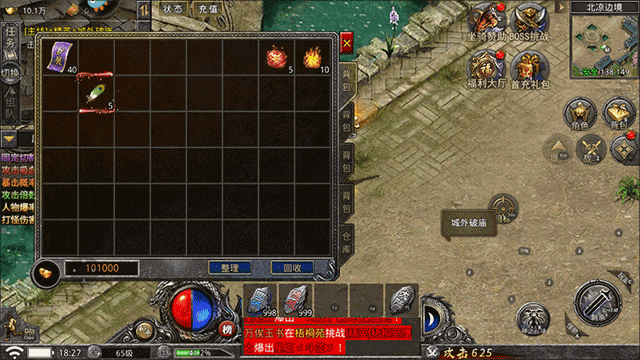 4、到达指定区域后,玩家可以打开背包界面,对角色穿戴的装备进行升级操作;