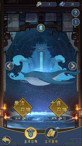 圣贤召唤:消耗圣贤令可以进行圣贤召唤,进行召唤的时候可以选择指定阵营的英雄池抽取,有几率产出五星英雄碎片、五星万能碎片和四星万能碎片。