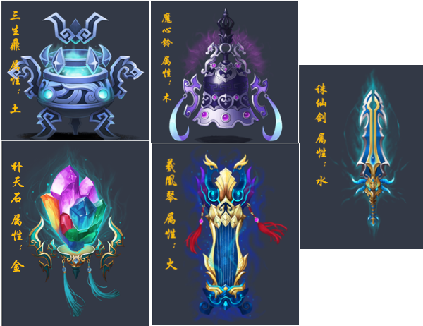 ① 法宝鉴定:使用鉴定卷轴可以随机获取法宝基础属性,法宝分为普通、仙器、神器三个等级,等级越高属性成长值越高;