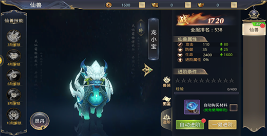 1、属性:仙兽系统激活后,可增加主角属性,提高主角战力;消耗成长丹可对仙兽进行培养升级,每升10级可以提升1阶。随着仙兽阶级升高,将会解锁更高属性和更加炫酷的特效;