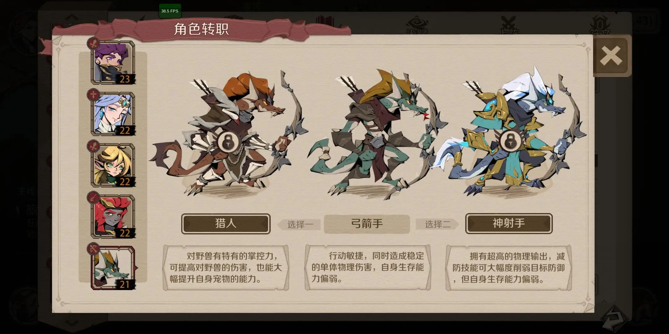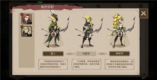 初始命中、攻击属性略高,根骨数值偏低,属于前期过渡使用的英雄;转职可以选择神射手,猎人两个方向;