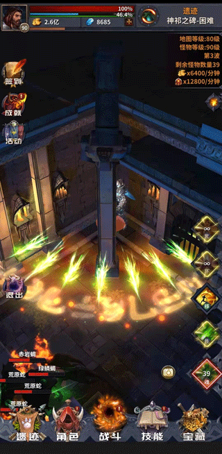 3、战斗界面点击钻石旁的加号可通过观看广告获取钻石;宝藏中的免费宝箱可通过广告加速五次;宝藏每日刷新三次,时间为早上六点、中午十二点与晚上八点,每次使用钻石刷新后,宝石、欺诈之语、技能书、副本门票等物品建议购买,广告次数尽量用完;迷惘副本产出技能,前期选择简单难度即可,共六波敌人;神祈副本掉落装备,该副本较为重要,建议有能力时选择普通难度挑战,可掉落35或55级橙色装备,困难难度则掉落75或95级橙色装备;进入地图后向右移动至角落,卡墙角攻击可降低前期暴毙风险。