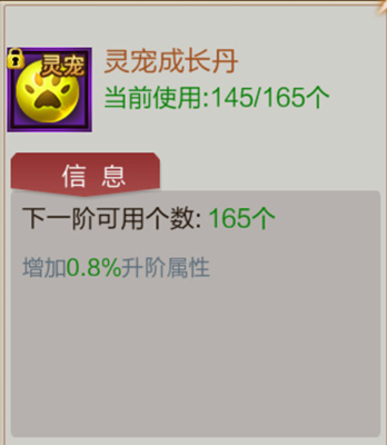 1、灵宠阶数达到3阶之后,玩家可以给灵宠喂食成长丹,成长丹可以按百分比提升灵宠的进阶属性;