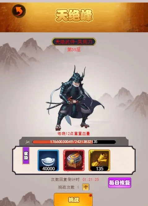当前配置下天绝峰可通关到55关,每日暂时需要购买2次挑战次数