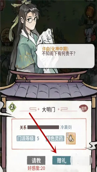 想要低风险拿到其他门派的特殊资源,可以选择“请教”这个功能。触发请教功能之前,需要先拜访对应门派,给门派掌门赠送礼物提升好感度,操作门槛很低。赠礼会逐步拉高对方掌门和你的好感度,好感度达标之后就能和平对话。不同好感度等级会触发不同的对话内容,也能拿到不同的奖励,好感度达到指定数值后,就能通过请教功能获取对方的专属奖励。