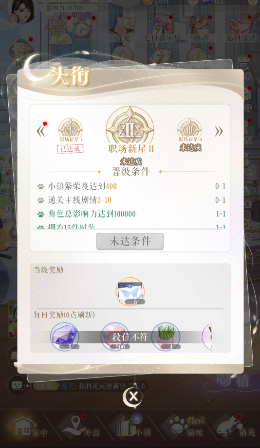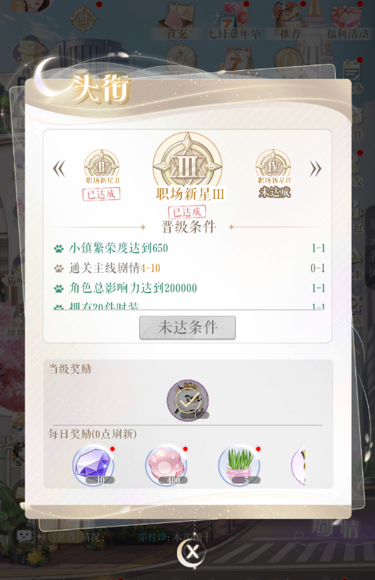 小主需要完成当前头衔对应的全部任务,才可以升级头衔,每次成功升级头衔后,都能拿到永久晋升奖励,每个头衔等级的晋升奖励只能领取一次。