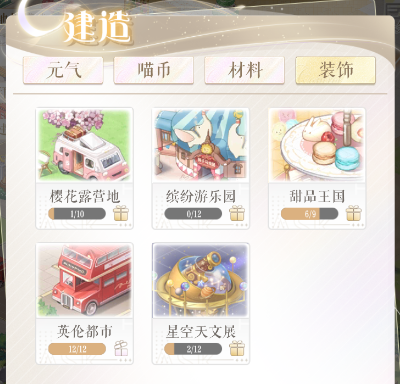 除了资源建筑外,还有多套装饰主题,可让小主自由打造、摆放,供小主体验建造小镇的乐趣;全套主题建设完毕还有收集奖励领取哦