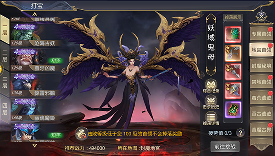 和专属BOSS、地宫首领的规则不同,封魔秘境挑战没有次数限制,但是需要玩家达到指定VIP等级才能进入;击杀和自身等级差超过100级的BOSS,无法拿到对应奖励;封魔秘境是稀有法宝的主要产出地,建议玩家组队进入挑战,还能共同抵御其他玩家的争抢;