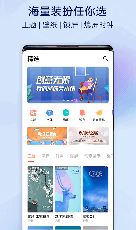 提供大量由专业设计师创作的主题、字体、铃声与壁纸等;部分机型还支持熄屏时钟,丰富选择满足不同喜好。