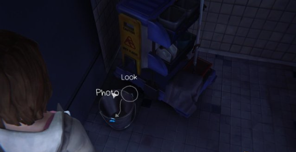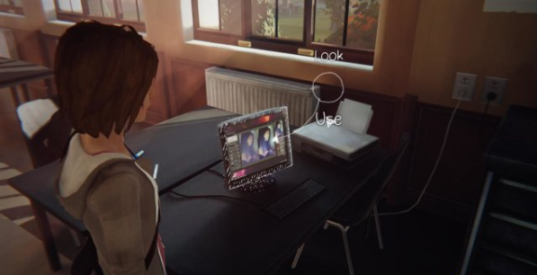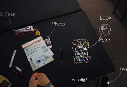 3. 将视线移到课桌上方,把鼠标光标移至画册右侧那张麦珂茜的背影照片上,按住左键拖到“查看”字样上,即可观察这张照片。之后所有查看物品、互动或对话都采用类似操作。