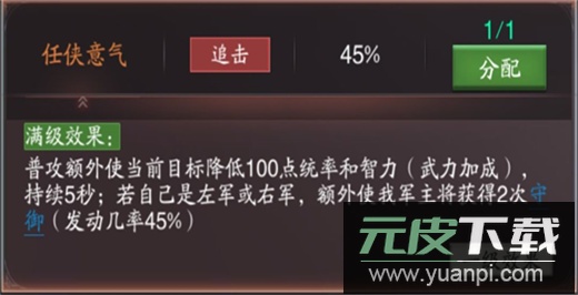 袁绍携带【反戈一击】与【任侠意气】。选择袁绍是为了触发三势阵效果,其群体治疗能力显著。【任侠意气】可降低敌方防御,并提供额外守御;【反戈一击】在此阵容中能起到出其不意的辅助效果。