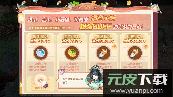 4、在主菜单点击资源阁,然后点击指定位置立即领取无限银币;