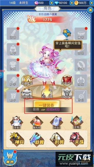 3、打开角色面板,点击一键装备即可快速穿戴,提升整体战力;