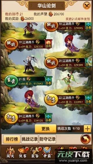 玩家的排名以通天塔形式呈现,需层层向上挑战,位置越高则排名越前。每日拥有十次免费挑战机会,可自行选择相邻的对手进行较量;若挑战排名高于自己的对手成功,双方位置将互换;若挑战排名低于自己的对手,则可直接扫荡通过。