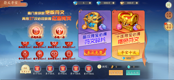 通过符文寻宝有较高概率获得稀有符文,品质从高至低分为红色、橙色、紫色、蓝色及符文碎片;十次连续寻宝必得橙色品质符文。
