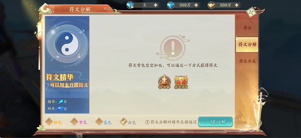 多余符文可进行分解,获得符文精华用于升级现有符文;分解时消耗的精华将全额返还。