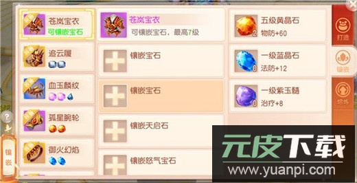 玩家可在镶嵌界面进行宝石的镶嵌、摘除与升级操作。