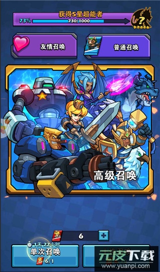 召唤门:在此处消耗钻石或召唤卷轴进行召唤,便有机会获得强力超能英雄;凭借你的运气,成为战场上的幸运之星。
