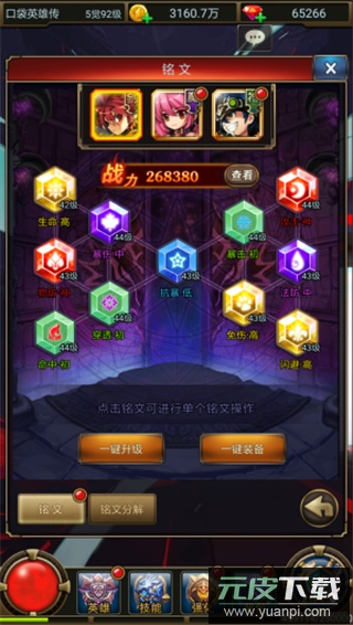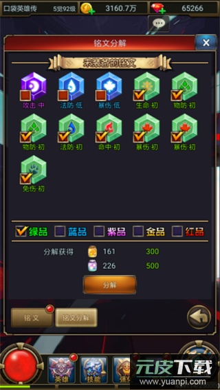 角色完成二次觉醒后,将开启死亡之塔与铭文功能。每位英雄可装备一套铭文,品质由低到高分为绿色、蓝色、紫色、金色与红色;铭文种类多样,包括攻击、防御、生命等多种属性加成。