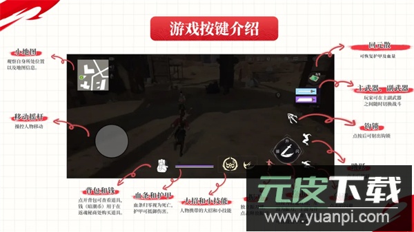 游戏界面按键分为移动区、功能区与操作区,旨在还原完整操作体验;具体按键功能可参考下图。