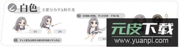 白色招式主要为平A与升龙;点按攻击键可打出两段平A,部分武器如阔刀机制不同,仅第一段为白色。