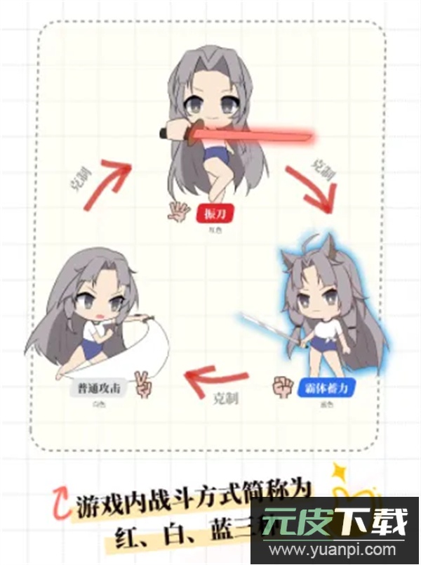 基础战斗可简化为红、白、蓝三种招式,其克制关系类似石头剪刀布。