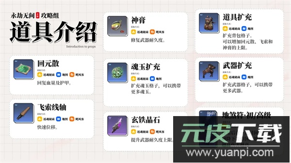 对局中会出现多种功能道具,例如回复血量的回元散、修复武器耐久的的神膏等;各道具作用与获取方式详见下图。
