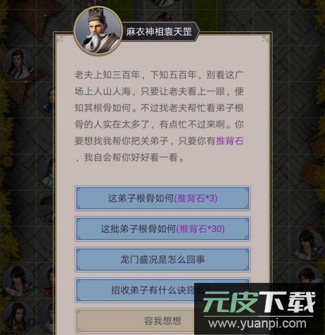 《山下集市》每日可购买推背石;注:当日购买后若提升集市等级,可再次购买。《总务大殿》会随机刷新奖励推背石的任务;注:大殿等级越高,对弟子品质要求也越高;注:若弟子籍贯符合任务地区需求,任务奖励将会翻倍。