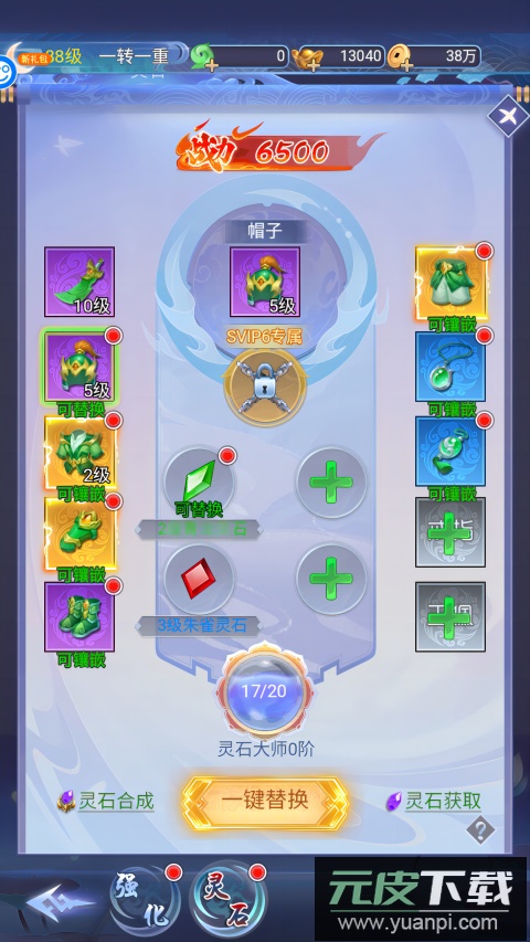 4、升级灵石:镶嵌灵石能为主角提供属性加成;点击灵石槽可在界面选择要镶嵌的灵石,若背包中存在同等级同类灵石,则可在该界面直接进行升级操作;镶嵌灵石的总等级达到要求后,可提升灵石大师的阶位,阶位提升会为主角增加大量属性。