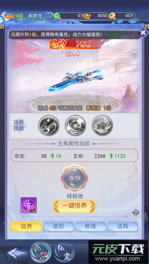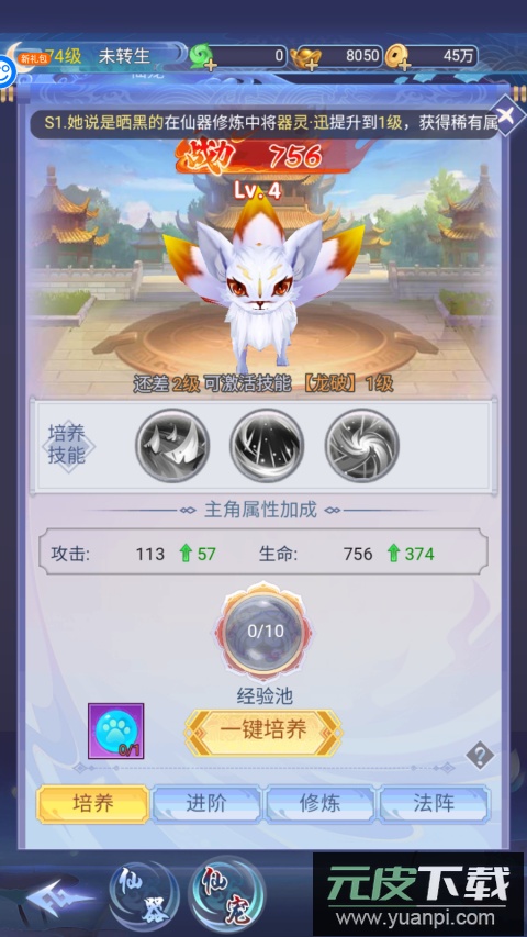 2、仙宠培养:仙宠经验池蓄满后自动升级,升级可为仙宠及主角增加属性,所有仙宠外观共享培养属性;培养达到特定等级后,可激活或升级对应的培养技能。