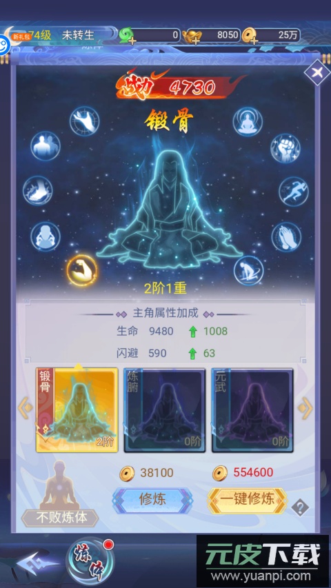 3、主角炼体:主角转生等级满足条件后开启炼体修炼,不同炼体所需的转生等级各异;消耗金币可对已开启的炼体进行修炼,为主角附加属性,修炼等级存在上限,达到后需提升转生等级才可继续;当激活的炼体达到一定数量且均修炼至指定阶数,可进行不败金身升阶,为主角带来大幅属性提升。
