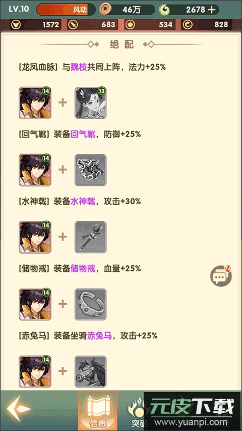 阵容搭配方面,游戏并未采用传统的阵营加成体系,而是更注重角色之间的羁绊联动。例如主角身负神龙血脉,与魏枝的凤凰血脉彼此呼应,同时上阵即可触发属性提升。此外,为角色装备契合的武器与防具也能激活额外加成。