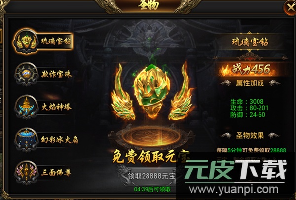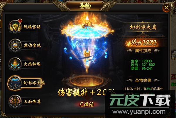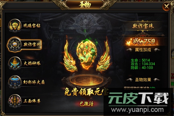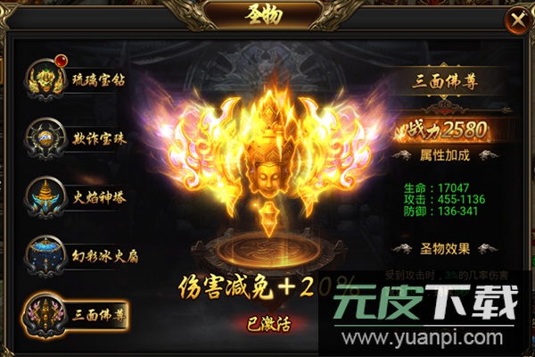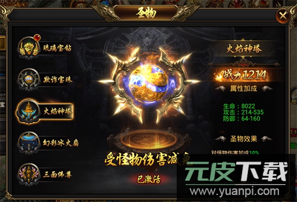 游戏内圣物系统包含五件神器:琉璃宝钻、欺诈宝珠、火焰神塔、幻彩冰火扇与三面佛尊;初始即可激活,无需额外投入。