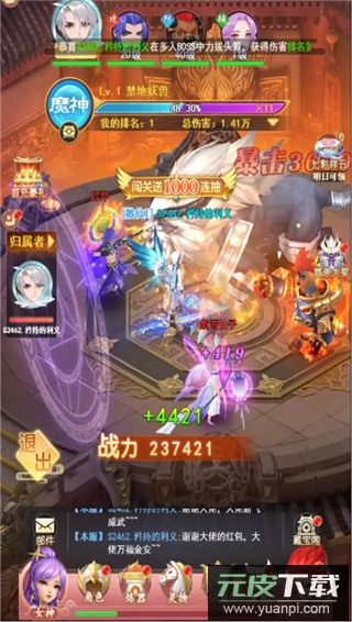 以下是三名天神同时上阵的战斗场景,四人同屏作战,场面颇具策略深度。