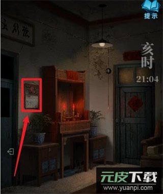 1、点击房门外出触发剧情;查看茶几时响起电流杂音,随后风扇吹落墙上挂历,拾取挂历后的【钥匙】。