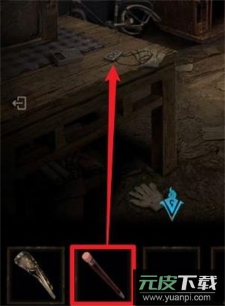 14、用【铅笔】修复左侧桌面上损坏的【磁带】。