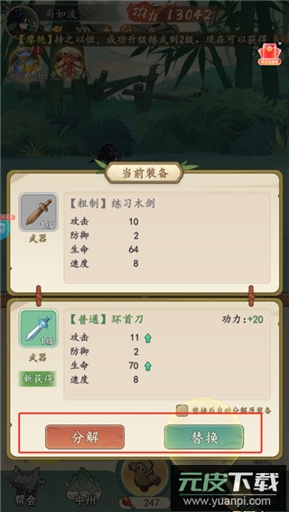 4、遇到同类装备时,可选择分解或替换,品质较差的装备建议分解,优质装备则用于替换;