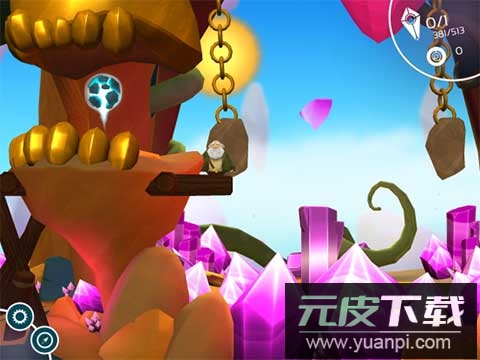 8、获得新魔法面具后掌握旋转屏幕技能;用两根手指同时点击并滑动右侧屏幕即可倾斜画面,使场景中可动物体位移;例如通过旋转让巨石滚落,清除障碍后跳上平台。