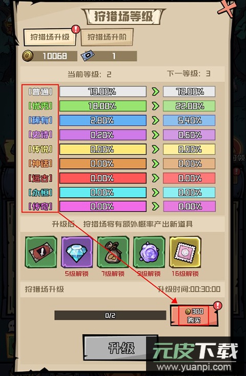 3、出售装备可获得金币。金币用于提升狩猎等级,从而增加高阶装备的获取概率;升级过程需要时间,玩家可使用加速券来缩短等待。