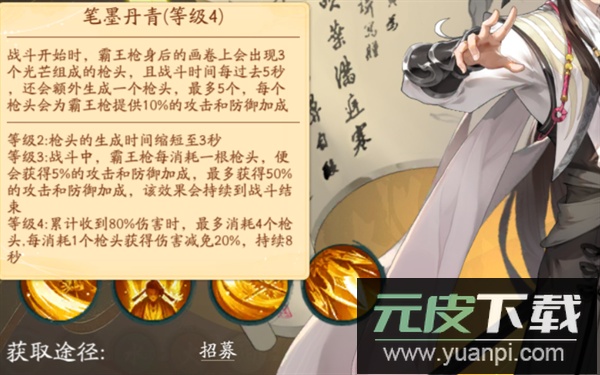 技能包括:霸王回马枪(绝技);笔墨丹青;