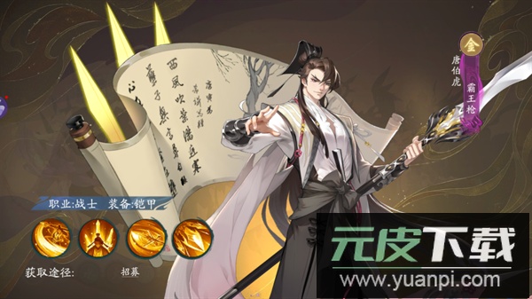唐伯虎隶属金系阵营,定位为战士,获取难度中等。