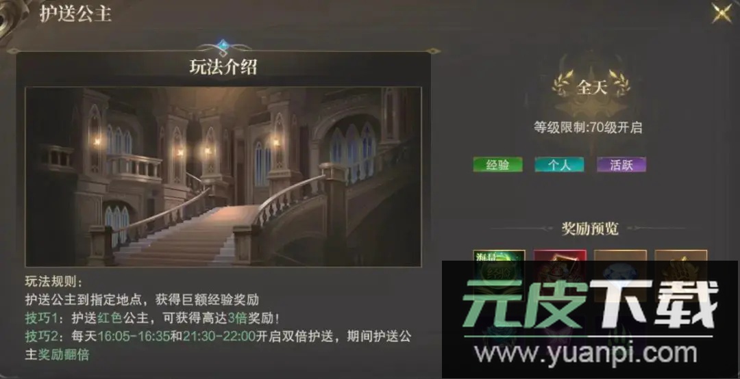 参与护送公主:完成护送公主的特别任务可获得丰厚经验奖励;选择红色品质的公主令奖励提升至三倍;每日在16:05至16:35以及21:30至22:00的双倍时段内参与,收益还会再次翻倍。