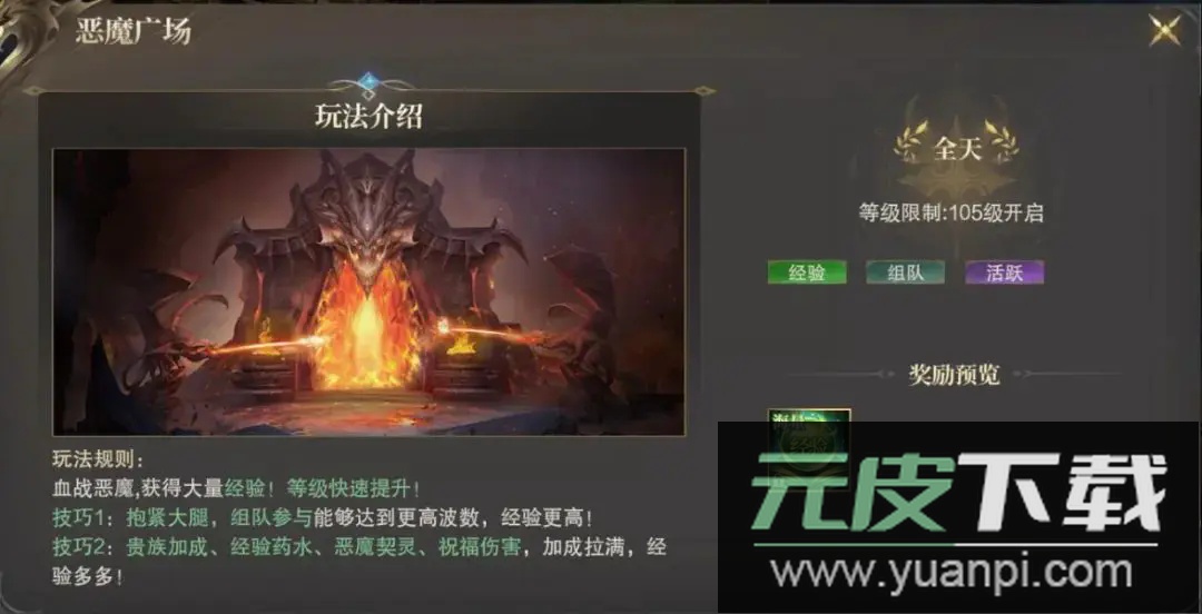 挑战恶魔广场:进入恶魔广场与源源不断的怪物战斗,能收获海量经验;建议组队进行挑战,队伍实力越强则能坚持更多波次;合理使用贵族特权、经验药水、恶魔契灵与祝福伤害等加成手段,可实现经验收益最大化。